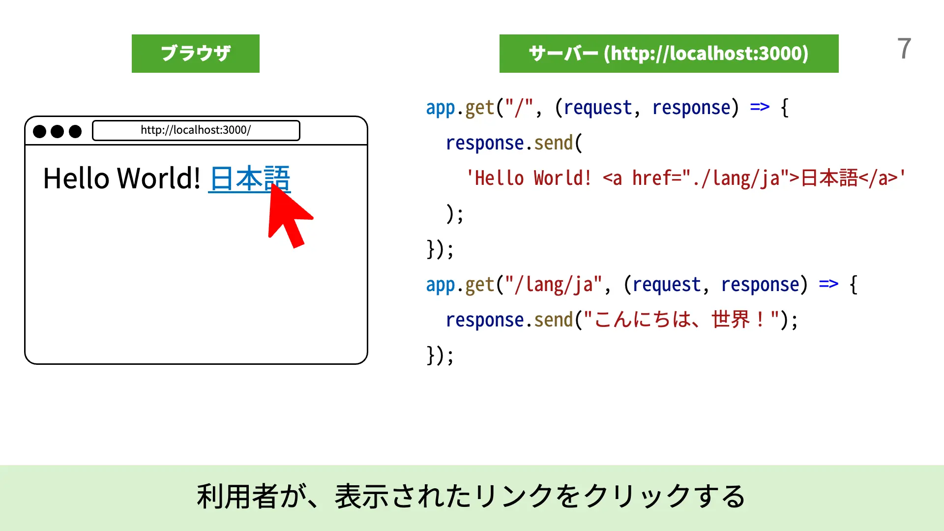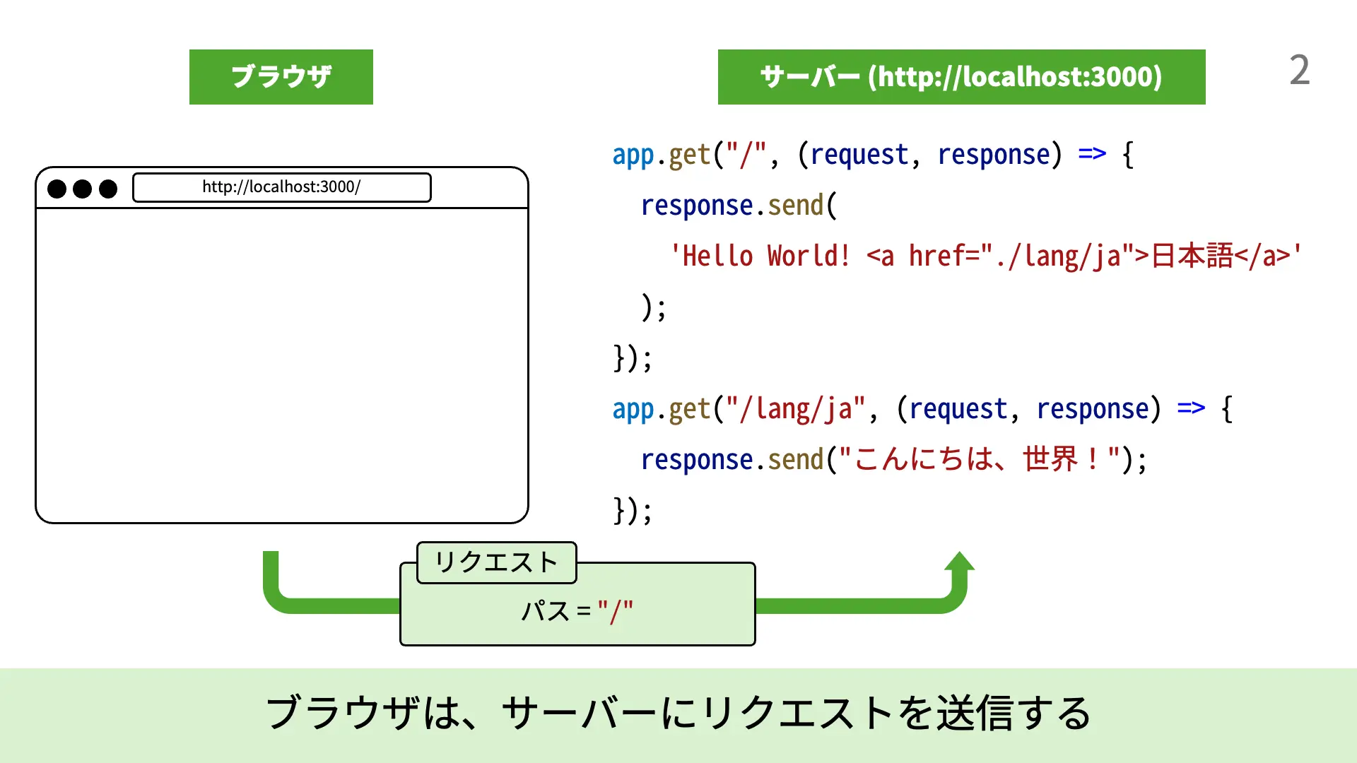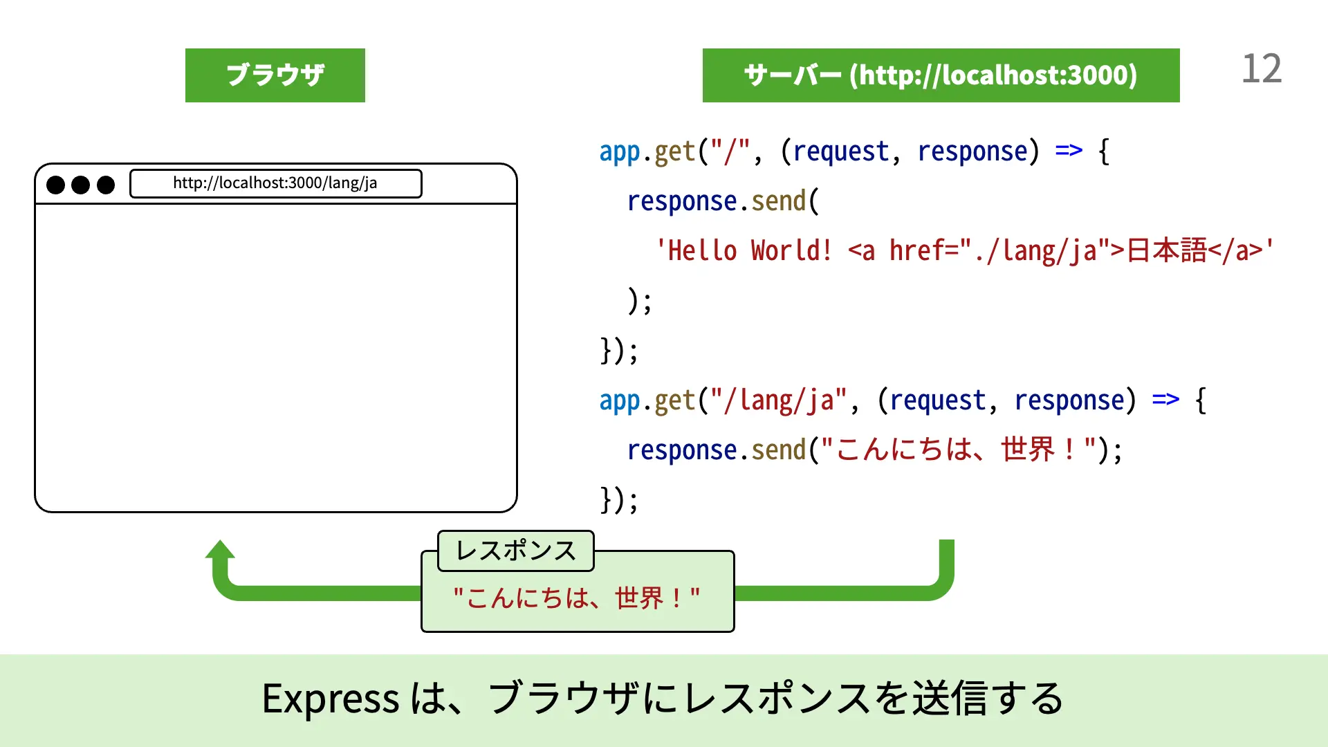 response.send(`...`);により、Expressは`Hello World! <a href="./lang/ja">日本語</a>`という文字列をレスポンスとして送信します。 - ブラウザは、受け取ったレスポンスをHTMLとして解釈し、