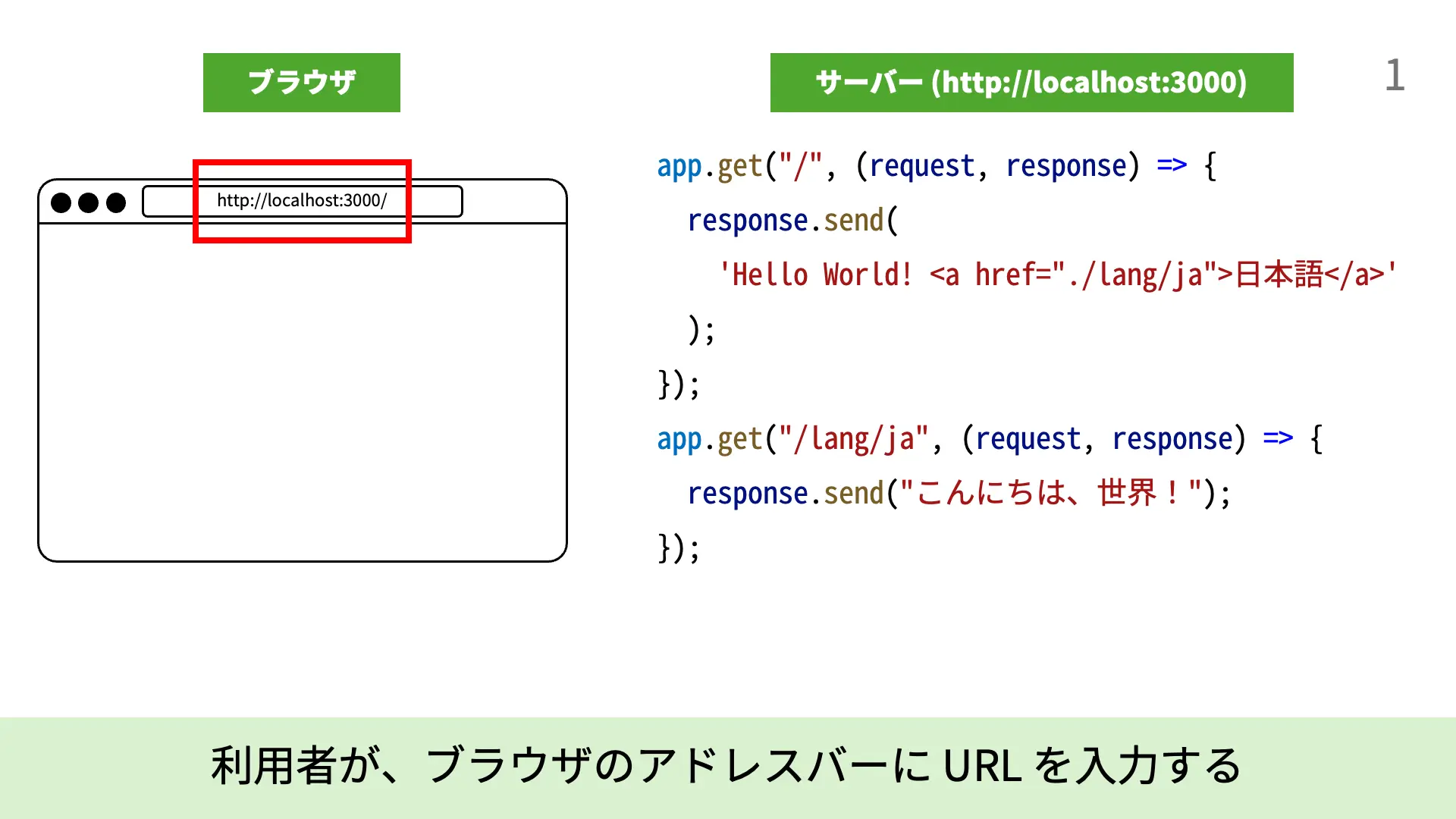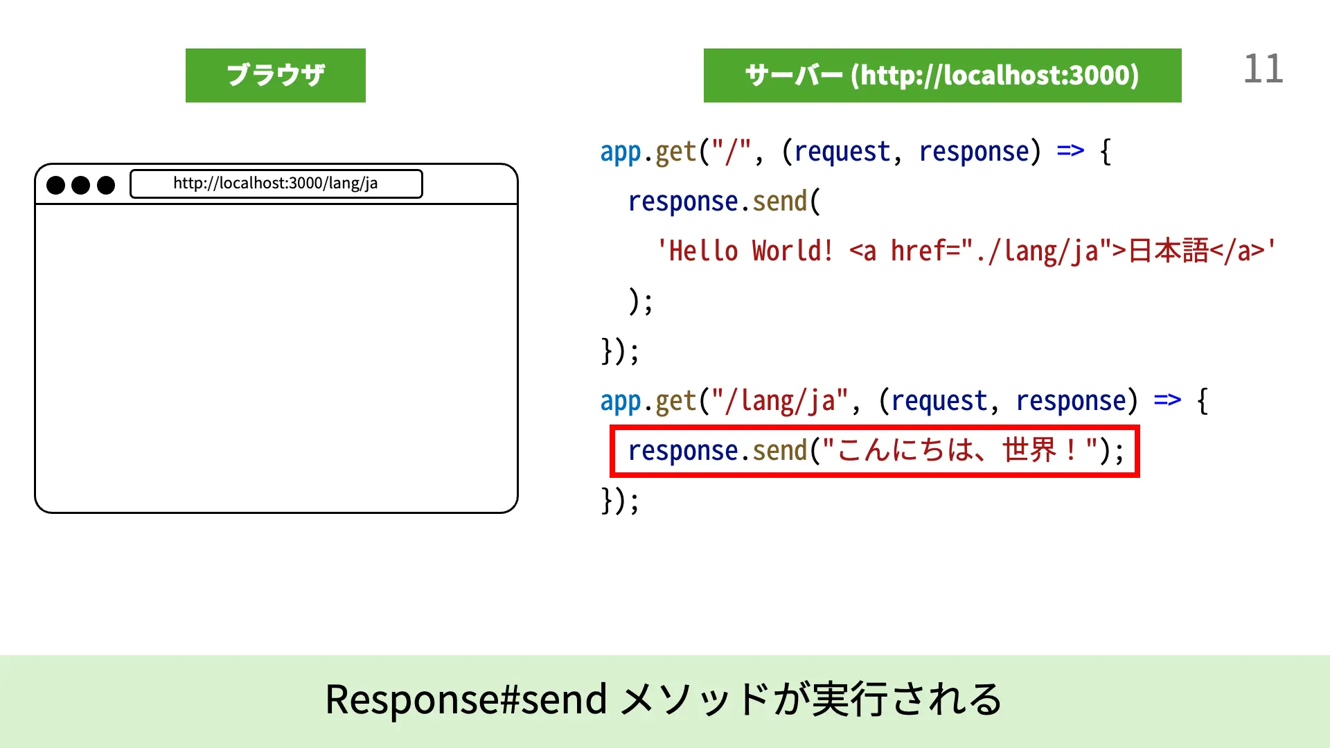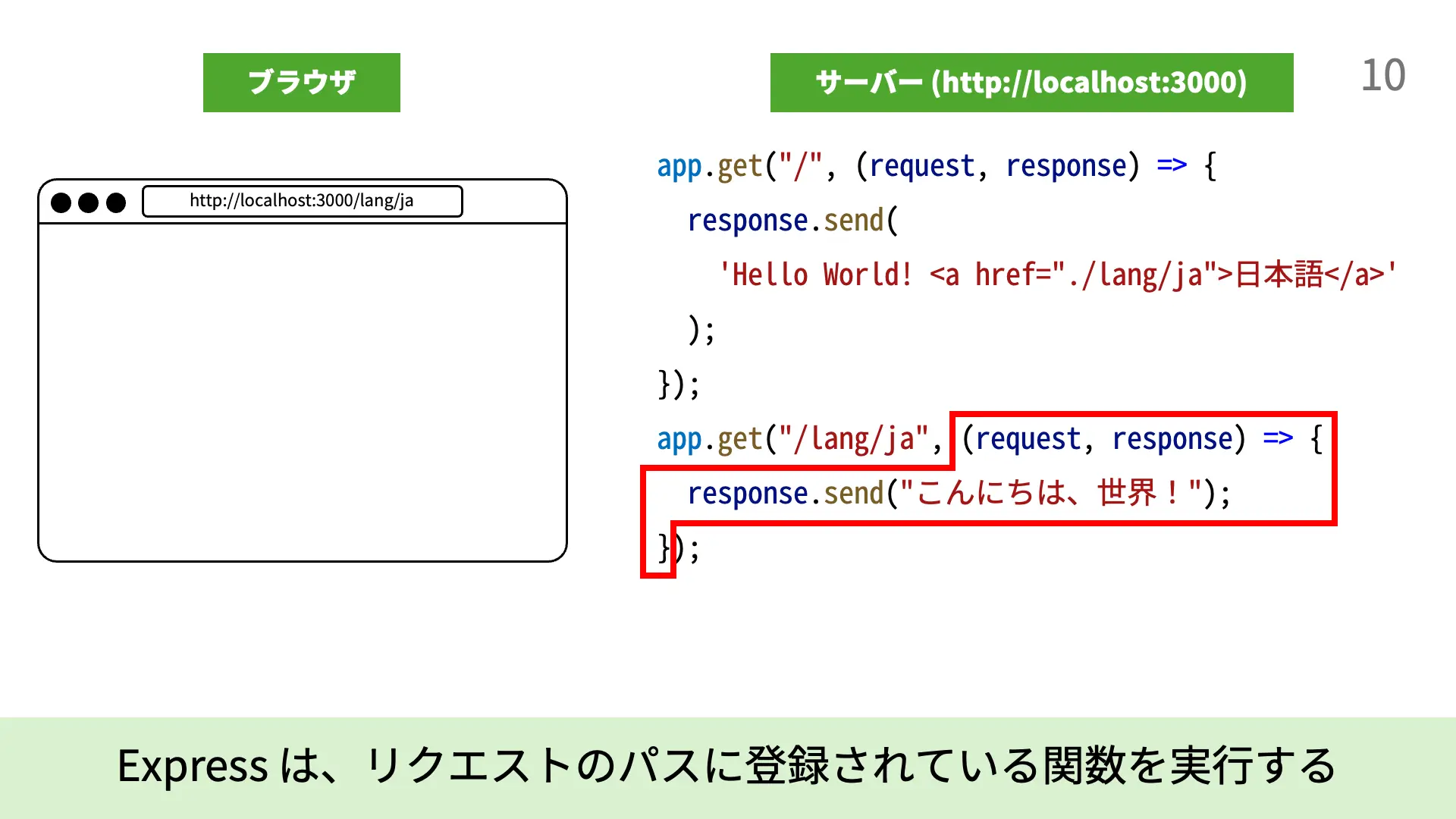 response.send(`...`);により、Expressは`Hello World! <a href="./lang/ja">日本語</a>`という文字列をレスポンスとして送信します。 - ブラウザは、受け取ったレスポンスをHTMLとして解釈し、